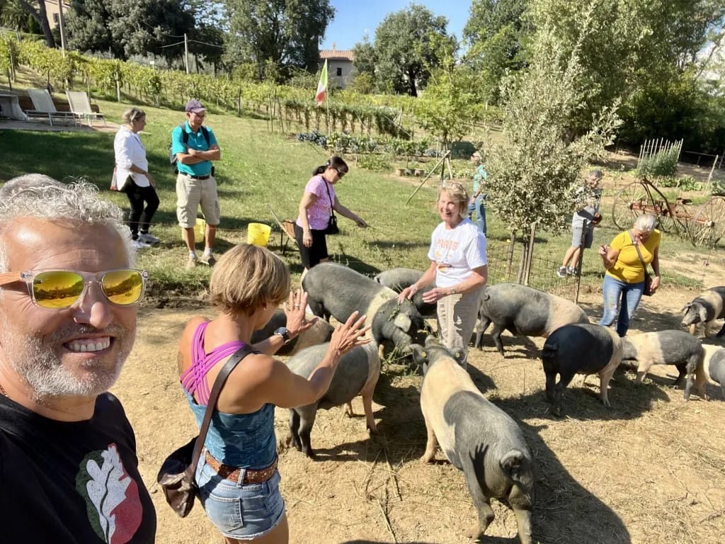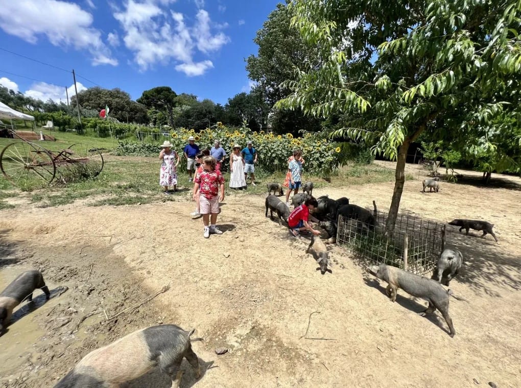 The Cinta Senese tour allows you to enjoy a unique experience visiting a genuine Tuscan farm: The visit begins with a spectacular view of Montepulciano among the age-old cypresses, following a walking path between olive trees and precious vineyards, where you will learn the history of olive groves and grapes cultivation. Along the way you will also find benches to rest, enjoying the beautiful landscape of Valdichiana. Afterwards, you will observe the pig farm, with the Cinta Senese pigs. You wiil be informed about this local breeds and their habitat. If you wish, you will also have the possibility to have contact with animals, move into the grazing area, in the food area, see the baths in the mud of the swines and the collection area of excrement.